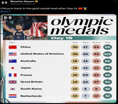美媒BR奥运奖牌榜改为按金牌数排列,中国39金第一