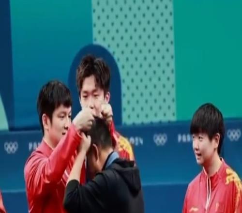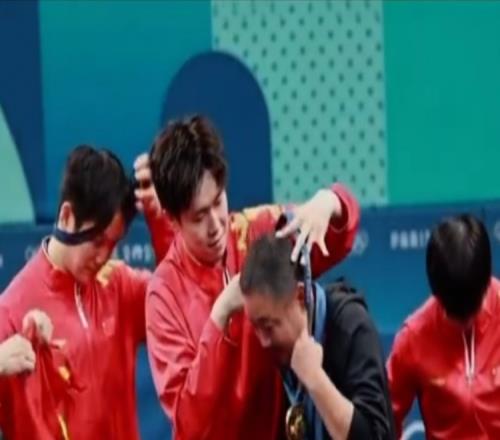 国乒拍完全家福后,孙颖莎提议队员一起把5枚金牌给刘国梁戴上
