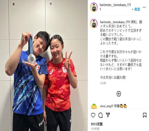 张本智和写道:“祝贺美和赢得银牌!你在首次奥运的表现太好了,能看到你在这个舞台战斗真的很棒。现在轮到你的大哥来追赶你了。”