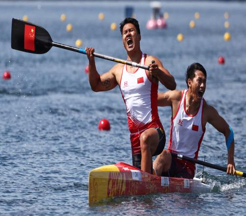 体育资讯8月11日报道宣称 巴黎奥运会皮划艇静水男子双人划艇500米决赛中,中国选手季博文、刘浩(图左)夺得金牌。看着升起的国旗,刘浩唱完国歌情不自禁流下泪水。