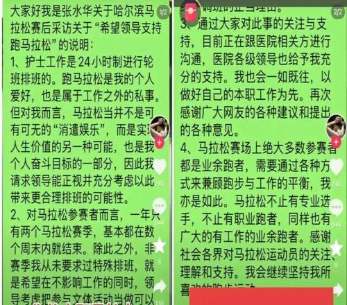 9月1日,张水华本人也在社交媒体上回应:护士工作是24小时制进行轮班的。跑马拉松是我的个人爱好,也是属于工作之外的私事。但对我而言,马拉松并不是可有可无的“消遣娱乐”,而是实现人生价值的另一种可能,也是我个人奋斗目标的一部分,因此我请求领导能正视并充分考虑以此带来更合理排班的可能性。