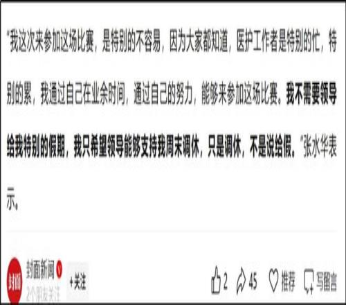 “医护工作者很忙,自己还要训练,所以希望领导支持自己调休。”