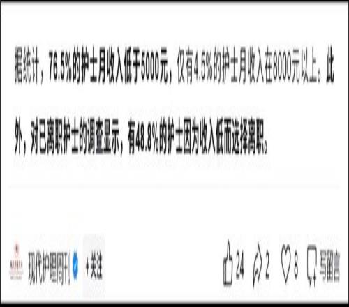 2021年,中国护理周刊上的文章指出,76.5%的护士月收入低于5000元,仅有4.5%的护士月收入在8000元以上。