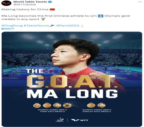 WTT(世界乒乓球职业大联盟)官方晒出了马龙的照片,配图THE G.O.A.T. MA LONG。配文:为中国创造历史,马龙以6枚奥运金牌成为了中国奥运历史上获得金牌最多的运动员