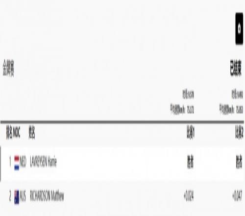 第一轮,荷兰选手拉夫雷森-哈里占得先机,澳大利亚选手理查德森-马修落后0.024秒;