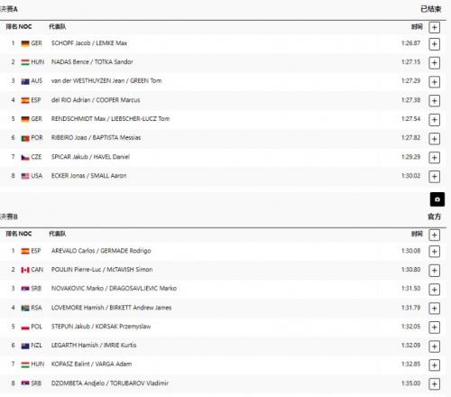 最终经过激烈角逐,德国组合以1分26秒87的成绩名列第一位,夺得金牌;匈牙利、澳大利亚组合分别拿到银牌、铜牌。