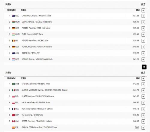 决赛A随后进行,最终新西兰组合1分37秒28夺得金牌,匈牙利、德国组合分别拿到银牌、铜牌。