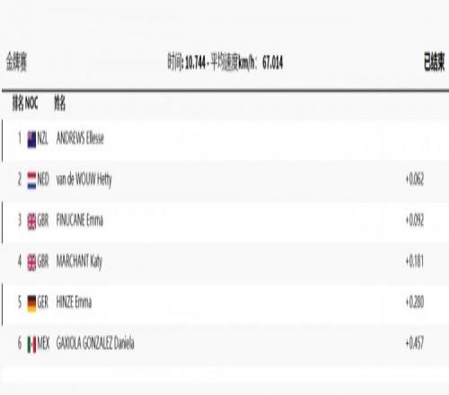 经过激烈角逐,新西兰选手安德鲁斯-爱莱斯拿到冠军,荷兰和英国选手分别落后0.062秒和0.092秒分别获得银牌和铜牌。