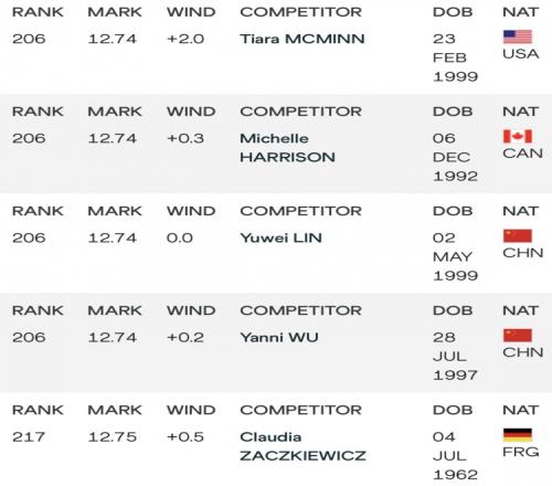 差距太大!吴艳妮林雨薇个人PB在女子100米栏历史上仅排第206位