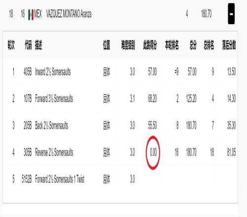 巴斯克斯在入水时变成了平躺,她出水后申请重跳,原因是觉得自己被看台的闪光灯影响了,但是申请被驳回,裁判给了她0分。
