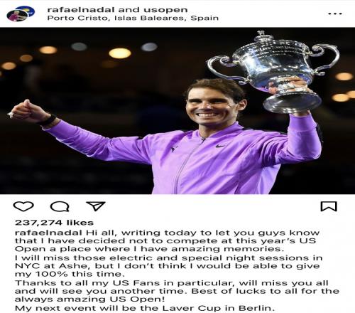 体育资讯8月8日报道宣称 今天,纳达尔在社媒宣布将退出今年的美网比赛。