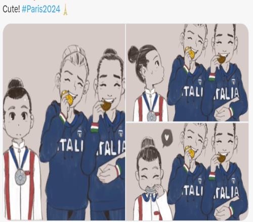 颁奖典礼上,她看到冠军和季军两名意大利选手咬金牌庆祝,愣了一下也跟着对镜头做出抿奖牌的动作,这个可爱的反应在外网走红。
