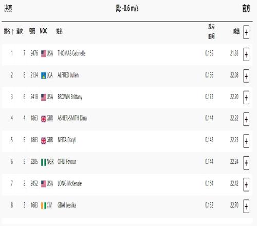 托马斯的成绩为21秒83,圣卢西亚选手朱利安-阿尔弗雷德银牌,美国人布列塔尼-布朗铜牌。