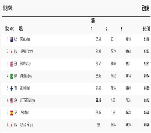 经过3轮激烈的角逐,最终,澳大利亚选手阿丽莎-特鲁以93.18分的成绩获得金牌,日本选手开心那92.63分获得银牌,英国选手斯凯-布朗92.31分获得铜牌。