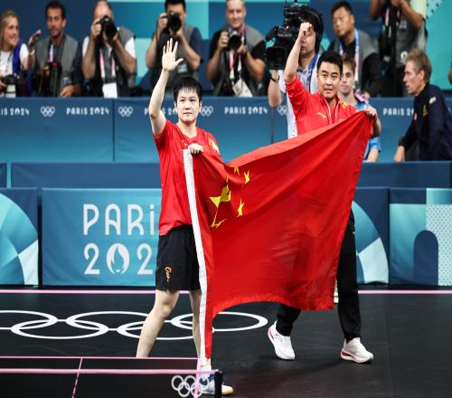 在南巴黎竞技场4号馆震耳欲聋的欢呼声中,樊振东终于赢下了梦寐以求的奥运男单金牌,成就“大满贯”。场外指导王皓也跨过挡板,挥舞双拳和弟子一起拥抱庆祝,一起展示鲜艳的五星红旗。王皓兴奋地在樊振东额头亲了一口,随即又将他抱了起来,那一刻,他终于举起了奥运冠军。