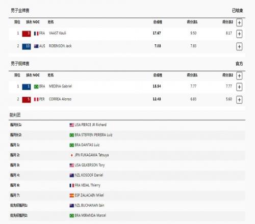 之前结束的铜牌赛中,巴西选手总分15.54分,击败秘鲁选手12.43分拿到铜牌。