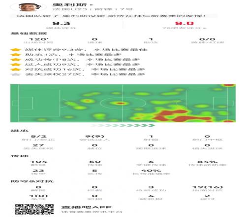 奥利斯本场1助攻+6关键传球9过人全成功20对抗16成功9.3分最高