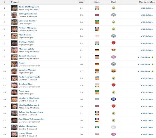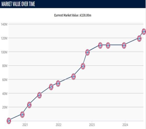本赛季拜仁整体成绩糟糕,但穆西亚拉个人的表现还是得到了认可,在2023/24赛季,穆西亚拉代表拜仁各项赛事出战38场,贡献12球8助攻。穆西亚拉今年身价连续两次上涨1000万欧,来到1.3亿欧,身价与维尔茨、罗德里并列排名全球第7。