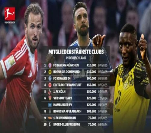 德国俱乐部注册会员数量榜:拜仁41万居首,多特、沙尔克二三位