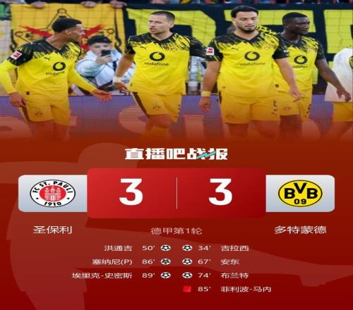 直播吧8月24日报道宣称 北京时间8月24日0点30分,德甲第1轮,多特蒙德做客米勒门体育场对阵圣保利。上半场,吉拉西头球破门,阿德耶米造点,吉拉西点球被扑。下半场,洪通吉扳平比分,安东和布兰特各进一球,马内犯规送点并染红,塞纳尼点球命中,史密斯远射绝平。最终多特蒙德3-3被圣保利逼平。本场比赛过后,多特蒙德积1分暂列第七,圣保利同样是1分暂列第八。