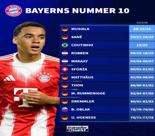 体育资讯7月1日报道宣称 拜仁官方宣布,穆西亚拉将在世俱杯之后改穿10号球衣,德国转会市场列出了拜仁的10号球员。
