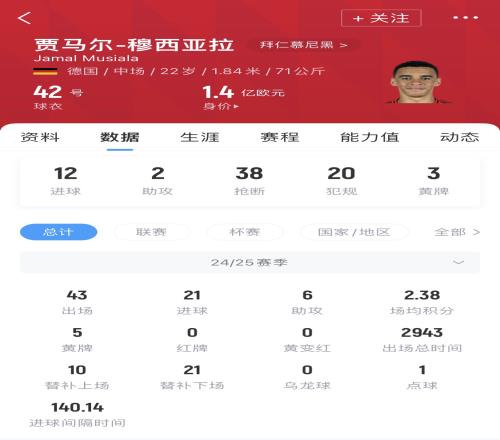 现年22岁的穆西亚拉身价1.4亿欧,2010年7岁的穆西亚拉加入南安普顿青训,2011年加入切尔西青训。2019年穆西亚拉加盟拜仁U17青年队,同年升入拜仁慕尼黑U19青年队。2020年夏天,穆西亚拉正式升入拜仁一线队。