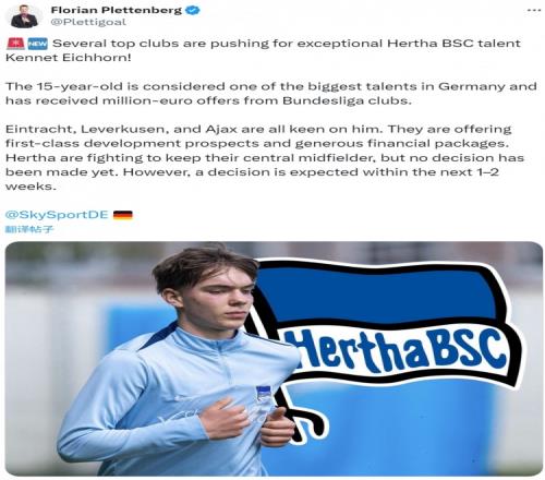 德天空:勒沃库森、阿贾克斯有意柏林赫塔15岁中场埃希霍恩