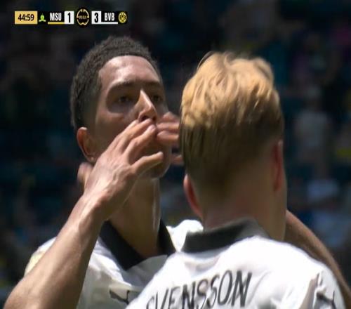体育资讯06月22日报道宣称 多特vs马梅洛迪日落第45分钟,乔布-贝林厄姆凌空斩破门,这是他的多特处子球。此时比分变为多特3-1领先。