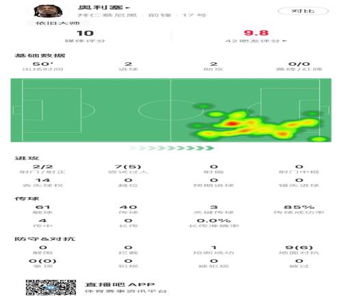 体育资讯6月16日报道宣称 世俱杯小组赛C组首轮,拜仁半场6-0奥克兰城,首发出战的拜仁右边锋奥利塞数据如下: