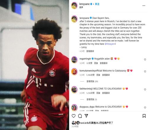 值得一提的是,今日早些时候萨内在个人社媒上发文,告别拜仁球迷。
