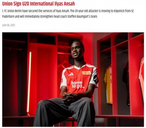 官方:柏林联合签下德国U20国脚前锋安萨据悉转会费400万欧+浮动