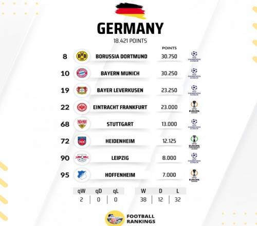 德甲球队欧战积分排名:多特全欧第8,拜仁第10,勒沃库森第19