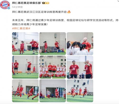 体育资讯5月22日报道宣称 根据拜仁慕尼黑俱乐部官博的消息,拜仁慕尼黑武汉江汉区足球训练营再度开启。