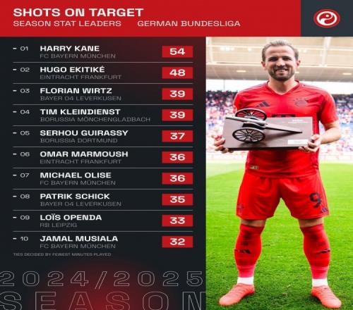 本赛季联赛凯恩54次射正,是德甲唯一射正次数50+的球员