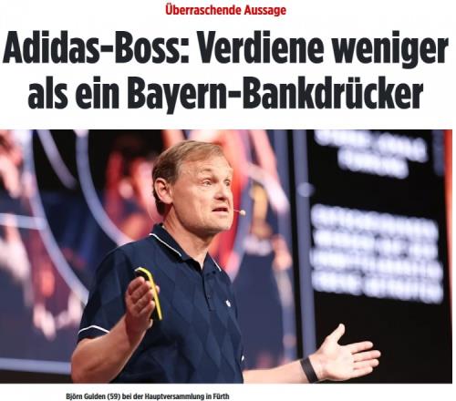 体育资讯5月18日报道宣称 阿迪达斯周四在菲尔特召开股东大会,CEO比约恩-古尔登表示自己的薪水比拜仁替补球员都少很多。