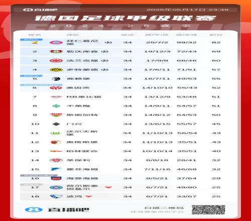 升降级方面,基尔、波鸿降入德乙,海登海姆将参加保级附加赛。