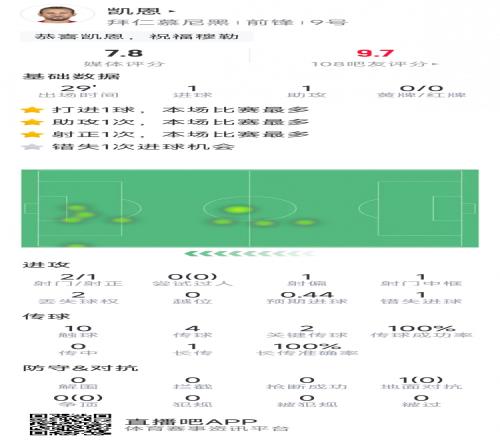 凯恩本场数据:替补登场传射建功,2射1正,1次中框,2关键传球