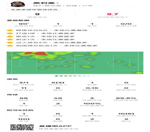 奥利塞本场数据:传射建功&3过人成功3关键传球,评分9.0全场最高