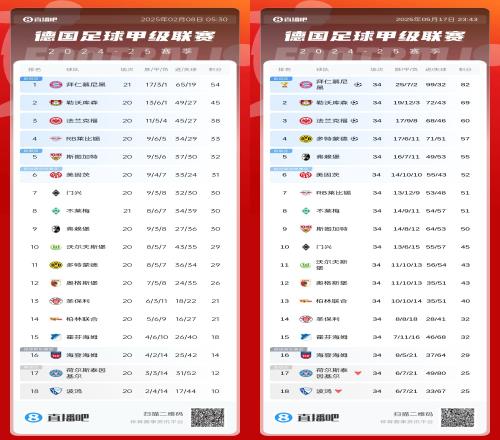 科瓦奇接手时积分榜&德甲最终积分榜对比