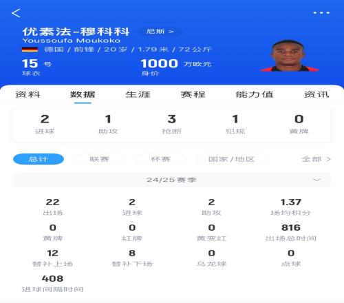 穆科科在2020/21赛季首次进入多特一线队,自那之后,穆科科在多特各项赛事出战99场,贡献18球8助攻。