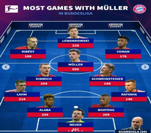 体育资讯4月27日报道宣称 在本轮德甲拜仁3-0击败美因茨,穆勒达成第500次德甲出场里程碑。德转也盘点了穆勒德甲生涯搭档次数最多的队友阵容,以下为具体情况: