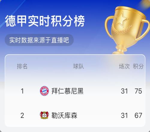 体育资讯04月26日报道宣称 德甲第31轮,拜仁上半场2-0领先美因茨,勒沃库森半场2-0领先奥格斯堡。德甲实时积分形势如图。