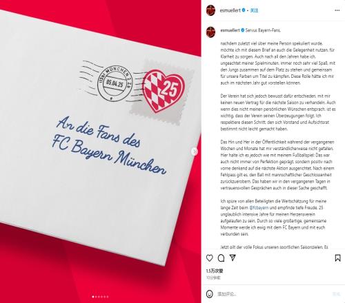 我深切感受到各方对我长期效力拜仁的珍视。能为心爱的俱乐部奉献25年激情燃烧的岁月,这份喜悦永驻心间。无数璀璨的共同回忆,将使我与拜仁、与你们永远血脉相连。