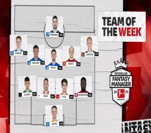德甲官方第22轮最佳阵:维尔茨、于帕领衔,比绍夫、劳姆在列