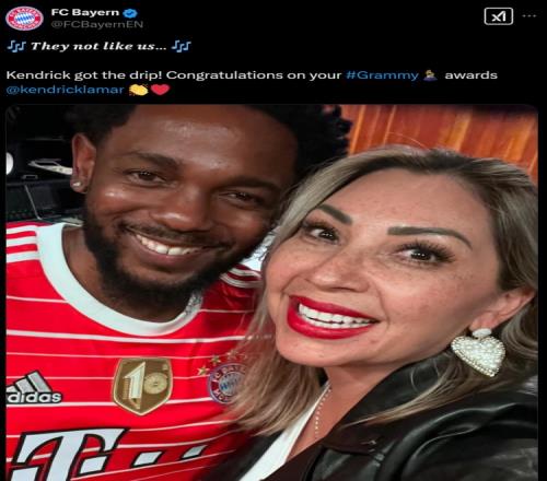 体育资讯2月3日报道宣称 今年的格莱美颁奖典礼已经结束,凭借热单Not Like Us,说唱巨星Kendrick Lamar斩获了年度歌曲、年度制作、年度最佳说唱歌手、年度最佳说唱歌曲和年度最佳录影带五项大奖。拜仁向他送上了祝贺。