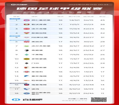 德甲积分榜:拜仁4连胜先赛7分领跑莱比锡被逼平掉到第5