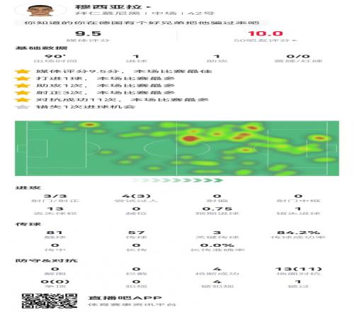 穆西亚拉本场1球1助攻+3关键传球13对抗11成功9.5分全场最高