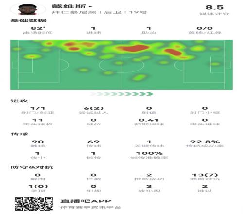 体育资讯12月21日报道宣称 拜仁在本轮德甲5-1领先莱比锡,戴维斯本场数据如下: