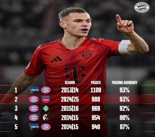 体育资讯12月14日报道宣称 拜仁官方社媒晒出队史德甲单场传球次数排名,上轮德甲拜仁4-2击败海登海姆的比赛,拜仁传球988次,仅次于2013-2014赛季对阵柏林赫塔的1109次。