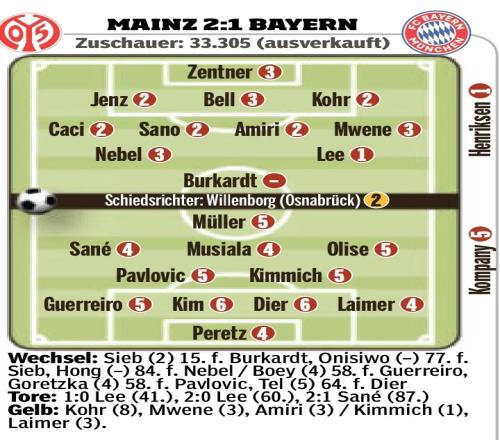 体育资讯12月15日报道宣称 在德甲第14轮比赛中,拜仁客场1-2不敌美因茨,德国媒体《图片报》对两队球员进行了评分。
